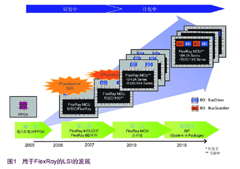 今后的车载安全系统的主要技术中,现在已得到广泛关注的是车载网络FlexRay。比起现今的主流产品CAN,FlexRay的特点是其高速性和高可靠性。在对驾驶盘、刹车、车身稳定等进行控制的未来车载电子控制系统中,FlexRay起着至关重要的作用。瑞萨加入了FlexRay的标准化研究团体,推动用于FlexRay的LSI(内置FlexRay控制器的MCU,FlexRay bus driver)尽快投入生产 (图1)。并即将展开对将MCU和bus driver打包 的SiP(System in Package)的研发工作。