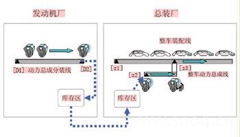 在Z1上线的车身,根据生产计划系统,配置具体的动力总成型号(机型、电喷系统和变速箱类型等)需求。在Z3位置将动力总成装配在车驾上,需按照车型配置单进行装配。发动机厂必须及时地保证总装需求的各型号的发动机动力总成供应到Z2工序。