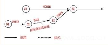 如图3所示,从Z1到Z3装配时间为60min,而D1点较Z1点提前60min获得排序信息,所以D1到Z3的产品生产周期必须小于120min,而Z2到Z3的生产时间为45min,所以从D1到Z2的生产(即动力总成分装完成送到Z2工序)时间必须小于75min。