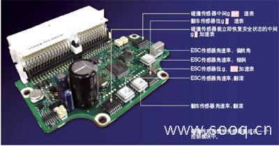 图3所示的安全气囊控制模块包括了用于碰撞传感/安全气囊控制和惯性传感/电子稳定性控制的传感器。