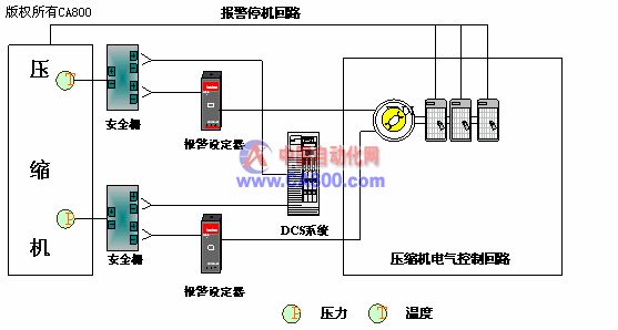 压缩机的连锁停机控制很重要,用报警设定器代替原有电气控制柜电-Ⅱ型仪表,改为低电压(24V)控制,在新的电气控制柜中增加24V继电器,控制压缩机的运行;利用报警设定器的模拟输出既保证信号的采集,又能完成压缩机的报警保护。在正常情况下,一旦压缩机运行,就不要求停机。报警设定器可解决在计算机出现故障或需要维护系统时,不停机控制压缩机的运行。这样即使在自控系统或计算机停止运行时,压缩机也能正常运行,减少了压缩机停机时间。