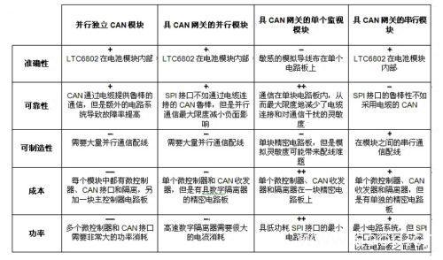 图1至图4给出了4种电池监视系统架构。假设一个由96个电池组成的系统以12个电池为一组分成8组,表1对这种情况下的每种架构的优点和缺点进行了总结。在每种情况下,一个LTC6802监视一个由12个电池组成的电池组。每种架构都设计为一个自主的电池监视系统,都提供到汽车主CAN总线的CAN总线接口,且与汽车的其余部分是电流隔离的。