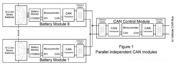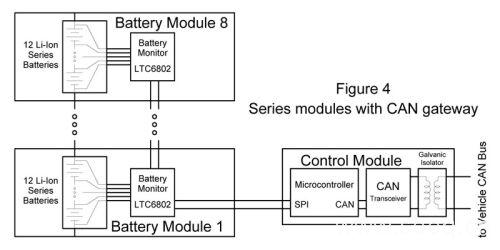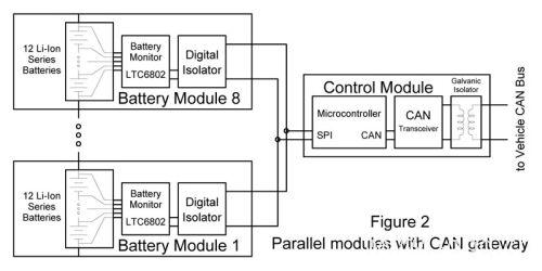 每个由12个电池组成的模块都含有一个电路板,板上有LTC6802和数字隔离器。这些模块与控制器电路板有独立的接口连接,控制器电路板上含有微控制器、CAN接口和电流隔离变压器。微控制器协调这些模块并提供到汽车主CAN总线的网关。