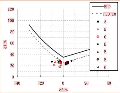 根据测得的数据,对主、次工程应变进行分析,并依照厂家提供的FLD(成形极限图),在10%安全裕度的情况下,区域E(见图4)是处于危险区域,这与实际情况吻合。