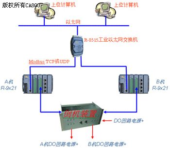 以下是我公司针对用户的实际需要开发的基于R-9x21以太网控制器和倒机装置的DIO采集控制系统双机热备方案,供大家参考。