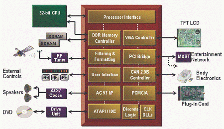 不用使用分立器件,仅把IP内核用于更复杂设计的一部分就可以给CAN或LIN总线提供接口。减少元件数量可以带来诸如降低整个系统的成本、降低库存、提高系统可靠性和减少PCB复杂性和层数等多方面的好处。如图2显示显示了一个通用的车内多媒体设计框图,该设计使用了CAN内核、PCMCIA接口、PCL桥接、IDE接口和其他功能,在设计阶段这些功能可以修改、变化,也可以根据终端用户的要求进行修改,通过对系统中的FPGA进行重配置,这个模式还可以扩展到现场修改或升级系统。