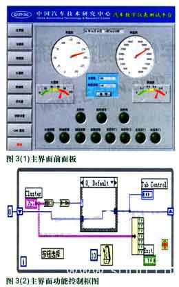 仪表测试系统软件采用N I公司的LabVIEW 8.20平台进行设计,本系统采用LabVIEW的图形化程序语言,以一种很直观的方法建立前面板人机界面和程序框图。前面板是用户可见的,类似传统仪器的操作面板,利用工具模板从控制模板中添加输入控制器和输出指示器,控制器和指示器种类可选择。程序框图是支持虚拟仪器实现其功能的核心,对程序框图的设计涉及节点、数据端口和连线的设计。连线代表数据走向,节点则是函数、Ⅵ子程序、结构或代码接口。本测试系统考虑到仪表整体功能测试和模块功能测试的需要,整个系统主要包括界面模块和各个功能测试模块,根据信号类型将仪表功能测试分为:车速表测试模块、发动机转速表测试模块、燃油表测试模块、水温表测试模块、开关量测试模块、CAN通信测试模块以及参数设置模块等主要功能模块。汽车仪表测试系统的软件总体功能框图如图2所示。