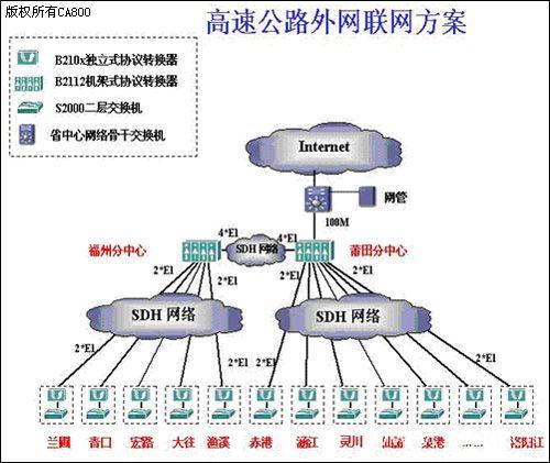 案 例 简 介 当前,随着国家经济的发展,政府、银行、企业、学校、公安等都出现了将各个地域上分散的分支机构组成一个专享网络(private network)的需求。与依托互联网和软、硬件防火墙组建的虚拟专网(virtual private network)相比,专享网络数据安全、和网络性能方面有显然的优势。对于这一个非常有潜力的市场,公路行业可以利用自身的光纤资源以及长途传输网络资源的优势,为高速公路上各收费站共享信息提供服务。对于地域分布广泛的客户,可以依托SDH传输网上大量空闲的E1 2M链路提供专网连接。由于高速公路线路延伸,公路上收费站数量增加,各收费站之间数据信息的互联和收费站各自内部局域网的大力建设等等对网络都提出了巨大的需求。因已拥有SDH传输网,且SDH具有端道端远程监控、故障告警、网络恢复和50ms自愈等功能,可以保证数据传输的安全性和可靠性。可利用现有的SDH E1线路资源,为高速公路收费站提供宽带数据网络。 用 户 名 称 福泉高速公路 用 户 类 型 交通 用 户 需 求 由于高速公路线路延伸,公路上收费站数量增加,各收费站之间数据信息的互联和收费站各自内部局域网的大力建设等等对网络都提出了巨大的需求。因已拥有SDH传输网,且SDH具有端道端远程监控、故障告警、网络恢复和50ms自愈等功能,可以保证数据传输的安全性和可靠性。可利用现有的SDH E1线路资源,为高速公路收费站提供宽带数据网络。 技 术 路 线 网络拓扑: