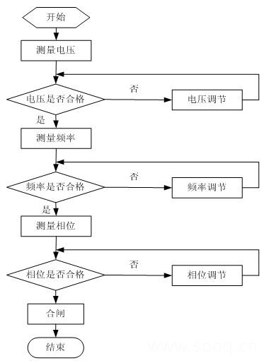 在电力系统的并列操作中,其核心是对并列条件的判断,因此在对自动准同期实验装置的设计中其重点也在于此[4]。其流程图如图1所示。