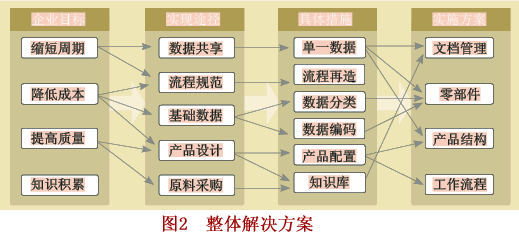 CAXA公司通过对重庆变速器公司的需求进行分析,如产品更改流程,了解图、文档的存放格式,分析图、文档彼此之间的关系及流动方式,资料存取权限与验证,区分系统模块等,最终提出PDM整体解决方案(图2)。