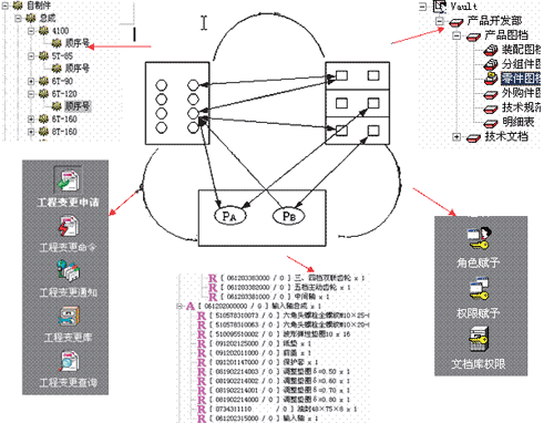该PDM系统采用客户/服务器体系结构:服务器端包括系统平台、数据库服务(ORACLE)、PDM服务;客户端功能模块包括文档管理、零部件管理、产品结构和配置管理、更改管理、权限管理、工艺数据等。同时,PDM系统以企业的文档、零部件、产品结构为管理中心,对它们实行严格的权限控制,实现更改管理、版本管理,并通过建立和维护这些对象之间的关系,保证所有数据信息的一致性,图3所示为产品数据管理方式示意图。