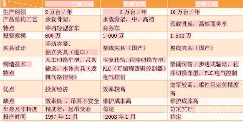 对于焊装线结构形式的选择,最需要考虑的是生产纲领、产品结构和工艺特点、投资规模和夹具设计制造技术水平以及厂房等情况,在细部结构上要结合产品的寿命周期、市场定位和质量要求,并对相关因素进行综合比较来进行选择。全顺厂焊装车间有全顺A线、全顺B线,未来要规划全顺C线,我们将这三条线做个比较(如表)。
