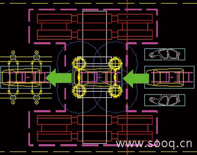 本体夹具采用平移式结构,每种车型配有一套侧围定位机构,分别存储在生产线的两侧,需要时前后移动到中间工作通道(如图5中间部分),换下的夹具从中间通道移到前后存储的位置,图5中可以存储4套定位侧围夹具,也能用新的夹具替换原来的夹具,增加了跟随市场变化的能力。
