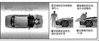 福特车上设计的一个弹身寸式发动机罩也具有AH功能,当车与行人碰撞时,该罩会弹起几英寸,对行人头部形成柔性的折邹带进行保护。