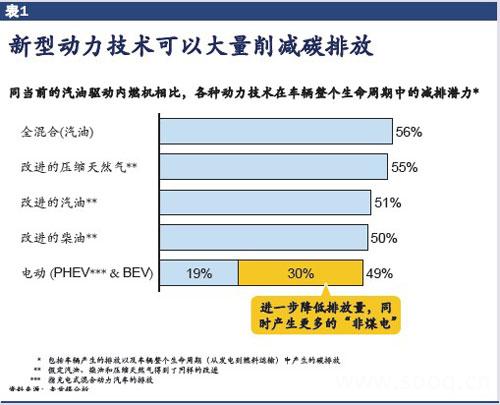 电动汽车:电动汽车包括插电混合动力汽车(PHEV)和电池电动汽车(BEV).与全混合动力汽车相比,插电混合动力汽车装有更大的电池,因此使得汽车可以在没有内燃机的辅助下所行路程更远.这种汽车可以用标准插座充电,只需内燃机提供少许动力.电池电动汽车一直要电池提供动力,而不需要内燃机机制的帮助.可虑到中国依赖煤电站发电,当今的电动汽车依靠现在的内燃机技术只能够有减少19%碳排放量的空间;然而,如果中国在电力供应方面使能源构成更加多元化,并向可替代能源转变的话,碳减排量会增加至49%.