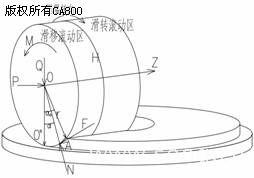 以图4所示的顺时针旋转的压辊为例,平模制粒机工作时,压辊上必定存在一条纯滚动的圆周线H,在纯滚动线H内侧,压辊发生超前性滑动,称之为滑转滚动;在纯滚动线外侧,压辊发生滞后性滑动,称之为滑移滚动。