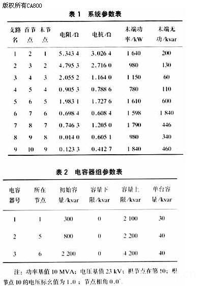 利用文章中所提的逐次线性规划算法,对一具有10个节点的典型放射性配电网络进行了测试计算,系统的基本参数见表1,电容器组参数见表2。?オ?