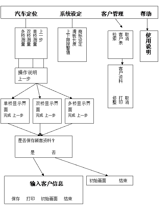 系统功能: 汽车定位:系统提供3种不同的汽车定位系统,分别为单桥定位,双桥定位和多桥定位,其中多桥定位需要检测6组车轮的侧滑量。 系统设定:可以设定侧滑量的上下限报警值,滑板的长度,以及当前被测车辆的商标。 客户管理:能够记录和修改已检测车辆的信息,并支持打印。 功能实现: 一.单桥界面: