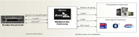 为了支持汽车多媒体应用,嵌入式系统的主要任务(称为“多媒体网关”)是适配并且转换专用和标准的通信协议,例如蓝牙协议、USB协议以及数字音频格式的解码。多媒体网关使用对软件升级开放的定制的可编程处理器,因此可以加快开发,并且可使汽车制造商能够对消费类电子市场的快速变化做出合适的响应。