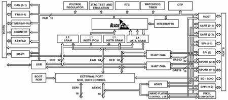 Blackfin多媒体处理器的内部结构如图2所示。连通性通过许多串行接口(3个SPI、4个UART、4个SPORTS和2个TWI)以及一个USB-OTG接口、一个ATAPI接口和一个SDIO接口提供。此外,它具有三个并行接口用于驱动显示屏、数码相机和另外一颗用于导航服务的处理器。两个CAN接口和一个MXVR接口可提供处理器与汽车内部总线之间的连接。