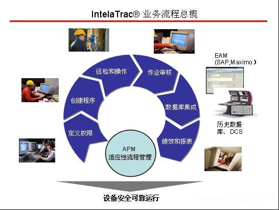 当工人开始日常巡检时,可携带IntelaTrac® 移动终端,并从中获取任务指令,而不再需要笔和纸进行记录。IntelaTrac® 会告诉相关人员应该去检查那些设备,检查那些项目,和设备的目标值等。当工人输入数据时,如果压力超过上下限,IntelaTrac 会发出警告。并提示工人最佳操作步骤,及时防范事故的发生。必要时,还可以自动向后台支持系统(如EAM 系统)发出设维修请求。并发送信息给相关生产主管和安全人员