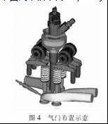 由于小型柴油机油束分布的特点,除必须有充足的进气量外,还需要较大的涡流比,因此在该柴油机设计中采用了四气门技术,即:双顶置凸轮轴驱动两个进气门和两个排气门,如图4所示。各气门都垂直布置,使气缸盖底面成为平面。
