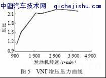 通过调节VNT(可变喷嘴环增压器)喷嘴环截面可调节进入涡轮的气体状态参数,以使涡轮始终在高效率区工作,并达到与发动机在各种工况下的最佳匹配(整个发动机外特性工况的增压压力基本保持恒定)。VNT主要由VNT总成、真空调节阀、真空管路等组成。根据发动机的运行工况,由发动机控制器ECU直接闭环控制VNT喷嘴环的开度,以保证发动机的进气量要求。VNT的润滑和冷却,由从发动机上引出的机油完成。典型的VNT增压压力特性如图5所示。