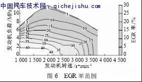 冷却式废气再循环系统(EBR)由EGR阀、真空调节阀、废气冷却器、废气管道、冷却管路等组成,EGR的开度是根据ECU中标定的控制脉谱来驱动的。实机研究表明,采用EGR系统在某一发动机工况,当废气再循环率为15%时,可以减少50%以上NOx排放,特别是采用改进的EGR冷却器后,可使NOx排放降低80%以上,同时减少了HC和PM的排放。图6为EGR率曲线。