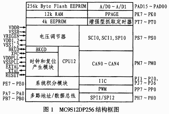MC9S12DP256的主频高达25MHz,同时片上还集成了许多标准模块,包括2个异步串行通信口SCI、3个同步串行通信口SPI、8通道输入捕捉/输出比较定时器、2个10位8通道A/D转换模块、1个8通道脉宽调制模块、49个独立数字I/O口(其中20个具有外部中断及唤醒功能)、兼容CAN2.0A/B协议的5个CAN模块以及一个内部IC总线模块;片内拥有256kB的FlashEEPROM12kB的RAM、4kB的EEPROM。图1所示是其芯片结构框图。