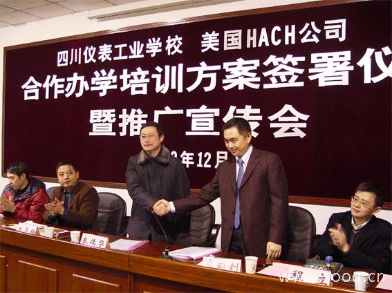 2008年12月15日,四川仪表工业学校与美国HACH公司合作办学培训方案签署仪式暨推广宣传会在座落于重庆市缙云山的四川仪表工业学校的报告厅隆重举行。HACH公司在中国取得不断发展的同时,更关注与支持中国环保教育事业的发展,为了促进中国环保中等职业教育的发展。在公司高层领导前期的亲自过问与接触下,HACH公司与四川工业仪表学校经过多次沟通切磋,愉快顺利地达成了合作办学的协议。四川仪表学校从2009年初开始,每年在其二年级的学生中择优录取学员开设水质仪器培训班,这些学员将在学校进行为期1个学期的水质分析仪器的培训与学习,毕业后将服务于国内水质分析行业。HACH公司为该培训班提供教学技术协助,这也是HACH公司为中国环保教育做出的又一份贡献。