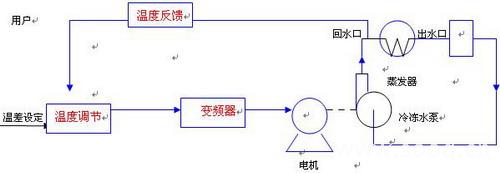 对于冷冻水系统,由于低温冷冻水温度取决于蒸发器的运行参数(一般冷冻水出水温度为7℃),只需要控制高温冷冻水(回水)的温度,即可以控制温差,现采用温度传感器、PID调节器、变频器组成闭还控制系统,冷冻水回水温度控制在12℃,使冷冻水泵的转速随着负载热负荷的变化而变化。控制原理见下图: