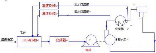对于冷却水系统,取冷凝器两侧冷却水的温度作为控制参数,采用温度传感器、PID调节器、变频器、冷却水泵组成闭还控制系统,冷却水温差控制在T2,本系统为5℃,使冷却水泵的转速随着负载热负荷的变化而变化。控制原理见下图: