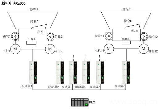 电控系统是由变频驱动器和PLC系统集成实现。筒仓底部有一个刮煤刀,刮煤刀由两个对称旋转的减速驱动齿轮的位置是对称的。这两台电机由一台110kw 的Commander SK系列变频驱动器SK6402驱动,SK6402则由PLC进行控制。艾默生CT变频驱动器用来驱动筒仓下端的刮刀电机,旋转的刮刀将筒仓的煤排出筒仓,通过调整煤仓出煤刮刀转速来控制出煤量。各个筒仓内装有不同需求的煤,当刮刀旋转时,筒仓内的煤将会从出煤口排出,落在同一传送皮带上进行混合之后,成品煤将直接送到货船上运送出港。