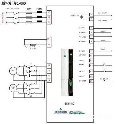 Commander SK系列变频驱动器SK6402变频驱动器电气原理如图2所示。因为变频驱动器同时驱动两台电机,因此在设置参数时需注意电机电流需设为两台电机的电流之和,即190.6A,不选用矢量控制而是选用V/F控制模式。