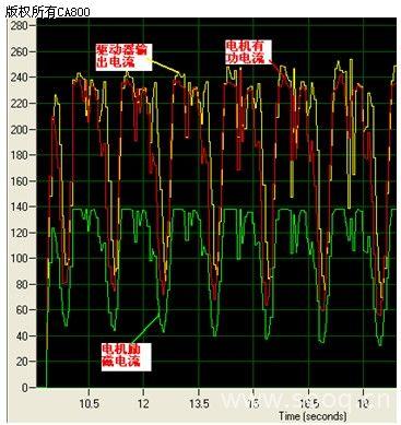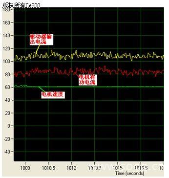 (3)堵转问题解决。针对这种情况,我们需要增大电压提升以补偿启动转矩,具体参数设置可通过监测电流、电机速度波形选出较佳曲线来确定。驱动器输出电压、频率及电压提升的关系如图4所示。经过调整电压提升值,系统在低频(2HZ)下能够正常运行,图5为监测到的电流、电机速度曲线。电流稳定在90~120A之间,速度曲线稳定,达到了预期目的。