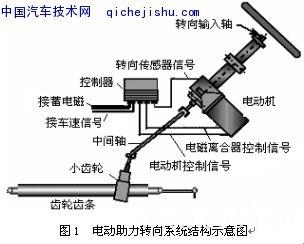 电动助力转向系统通常由转矩传感器、车速传感器、控制单元、电动机、电磁离合器和减速机构等组成(如图1)。其基本工作原理:转矩传感器测得的方向盘转矩信号和车速信号一同送给控制单元,经控制单元处理和计算以决定电动机助力电流的大小,然后通过电磁离合器和减速机构实现转向助力。