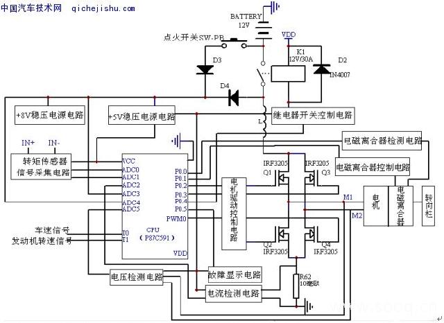 转向系统作为汽车的一个重要组成部分,其性能的好坏将直接影响到汽车的转向特性、稳定性和行驶安全性。实践证明电动助力转向系统(EPS)具有节能、成本低和便于控制,易于装车,提高操纵稳定性和轻便性以及符合机电一体化的要求等优点,正迎合了时代的要求。自从1988年EPS在日本商业化以来,相继得到了国外各大汽车企业的大力开发和广泛应用,不仅用于微型汽车和小型汽车,还广泛应用于轻型汽车及普通型轿车上。国内近几年也得到了相当的重视,也有一些车辆(如昌河北斗星轿车)安装了进口EPS,但还没有自主知识产权的EPS进入市场,从几家研发的产品看出,这其中的因素有很多,特别是车辆在行驶中系统的故障在线监测、故障自诊断和安全防范,以及EPS装车后的行车安全性等方面还不能很好的得到保证。
