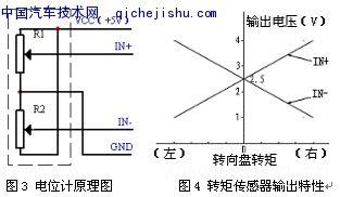 我们开发的电动助力转向系统应用的是摆臂式的转矩传感器。其工作原理相当于一个电位计,如图3所示,它具有双回路输出,即主扭矩(对应IN 端电压值)、副扭矩(对应IN-端电压值)输出,其主、副扭矩输出特性如图4所示,即当转矩传感器正常工作时,电位计的两个输出即主扭和副扭信号,理论上,正常工作范围在1V~4V,并且当转向盘处于中间位置时,转矩传感器的主扭和副扭的输出电压均为2.5V。一旦其本身及信号采集电路(如图5)出现异常,输入CPU(我们选用P87C591芯片为核心的8位微控制器,其本身自带有A/D转换器)的主、副扭矩信号将大于4V或小于1V或两信号之差超过3V。但实际车辆行驶中,虽然硬件和软件设计中考虑了各种抗干扰措施,各种偶尔的噪声或振动还是或多或少的会引起转矩信号的暂时偏差,而这种偏离是暂时的且系统能自动修复,故将转矩信号的异常界限值设为0.9V -4.1V,并且只有当信号值超出其范围持续一定时间(如30ms),才判定转矩传感器有故障,这样可以减少因其它外界原因而引起对转矩传感器故障的误判。