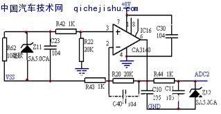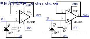 转向助力大小是通过控制电机电流来实现,因此检测电机两端的实际控制电流就显得非常重要。电机电流采集电路(如图6),通过测量串联在驱动回路中的精密电阻R62两端的电压,经过信号放大和适当的电容滤波,然后通过ADC2端口反馈给CPU,此时程序设计将此电压与理论计算电压进行比较,如果两者悬殊过大;或者连续几分钟之内的平均电流消耗超过预先规定的数值,就判断电机及其线路有故障,以防止电机过载而烧坏或工作不稳定。其中我们选用的精密电阻值约7mΩ,这样和电动机电枢电阻168mΩ相比要小的多,因此基本不影响系统工作。