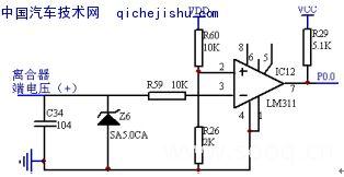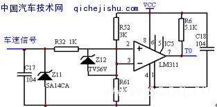 车速信号和发动机转速信号都是数字信号,因此不需要经过A/D转换,只需经过一定的整形电路,就可以直接送给CPU的定时器/计数器端口,然后通过计数器对波形的一定时间内的计数即可采集车速和发动机转速。如车速整形电路(如图7),车速信号通过一定的滤波和比较器比较,然后直接送给CPU的计数器T0。通过上述信号的采集,然后与相应工况的规定值比较,即可以诊断如下故障: