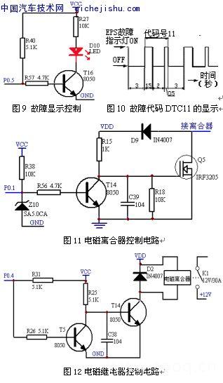 当系统检测到各组成部件出现上述异常之一,且持续时间超过相应的规定值,程序设计就通过对P0.5端口间断的置0或1,故障显示控制电路(如图9)就控制发光二极管(故障灯)闪烁,其中闪烁的次数和延续的时间(各种故障代码)通过计数指针和延时子程序实现。如主扭矩信号出现异常,指示灯将显示故障代码号DTC11,如图10所示,亮1.5S,暗2S;再亮0.5S,暗3S,往复进行,直至故障排除,称“一长一短”。 故障显示的同时,程序设计也对P0.4和P0.1端口分别置1和0,经过电磁离合器控制电路(如图11)和继电器控制电路(如图12)使得电磁离合器和继电器同时被切断,以确保电机助力完全被切断,从而确保行车安全。