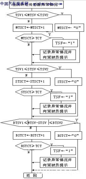 此外,转矩传感器的信号检测是建立在 5V的稳压电源基础上的,因此稳压电源电路的正常与否将直接影响到主、副扭矩信号。因此在检测转矩传感器主、副扭矩信号异常之前,首先判断转矩传感器电源电压是否在规定范围内。考虑到三端稳压集成块MC78T05在环境温度影响下其输出电压会有±0.1V的偏差,因此我们规定其正常输出电压为5±0.2V。如果CPU检测到电源电压异常,此时就跳过对转矩传感器信号的检测,这样可以避免对转矩传感器本身故障的误判。