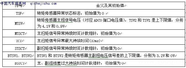 转矩传感器故障诊断流程如图13所示:首先初始化时间延时计数指针、异常状态标志和各规定界限值(如表1),然后使主、副扭信号电压及其差分别与各自的界限值进行比较,如果超过界限值并持续时间超过30ms,那么将异常状态标志置1,记录异常情况并控制故障灯显示相应的故障代码,同时分别对P0.4和P0.1置1和0,以切断电磁离合器和继电器,从而切断电机助力。