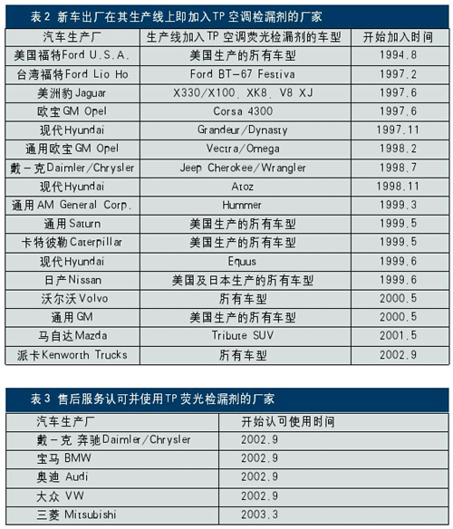 目前国内的一汽轿车在其红旗车上已开始试装TP公司的干片状空调荧光检漏剂。长安福特、北京吉普、江铃汽车、上海通用等已在开始采用TP荧光检漏产品对发动机机油渗漏进行100%或抽查检测。相信随着与国外汽车技术的接轨,越来越多的汽车制造商将采用荧光检漏技术,快速、简便、安全、准确地发现微小渗漏,提高产品质量及售后维护水平。