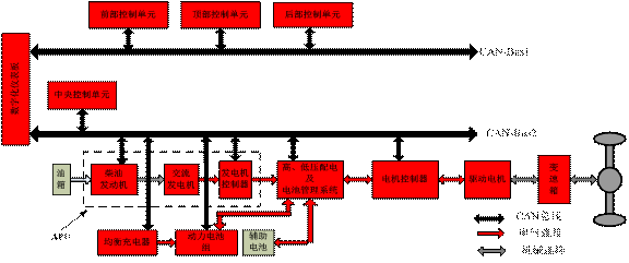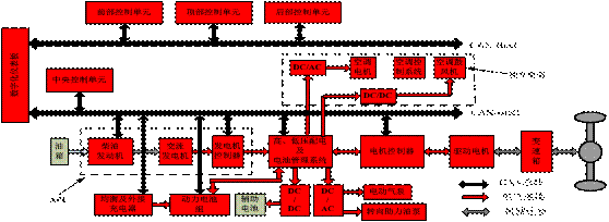 我公司组织研发的“混合动力电动城市客车”采用的是中央驱动典型的串联式混合动力系统。串联式动力由发动机、发电机和电动机三部分动力总成组成,它们之间用串联的方式组成SHEV的动力单元系统。负荷小时由电池驱动电动机带动车轮转动,负荷大时则由发动机带动发电机发电驱动电动机。当电动车处如启动、加速、爬坡的工况时,发动机-电动机组和电池组共同向电动机提供电能;当电动车处低速、滑行、怠速的工况时,则由电池组驱动电动机,由发动机-发电机组向电池组充电。