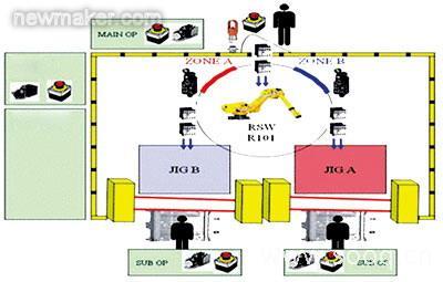 汽车生产中的车体焊接生产线包括主控制面板、焊接工作台JIG A和JIG B以及工人操作台等部分。其中,MAIN OP 面板控制主设备的启动、停止,SUB OP为局部操作面板。汽车车体的焊接工作过程为:焊接机器手对进入工作台A、B中的车体进行焊接,当A焊接完成后,该车体自动退出焊接工作台A,等待下一个车体进入焊接,同时,机器手转向工作台B,对进入该工作台的车体进行焊接,焊接完成后的车体退出工作台B,等待下一个进入,同时机器手返回A中对已就位的车体进行焊接……如此周而复始。在这个过程中,安全急停开关可在设备出现异常情况下立即停止其运行,在焊接工作台与工人操作台之间安装的安全光幕可以防机器手工作期间人员身体的进入,在机器手工作半径附近的区域还可以安装激光区域扫描器,防止人体进入危险区域。