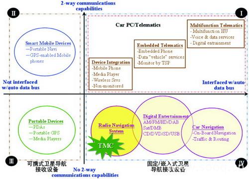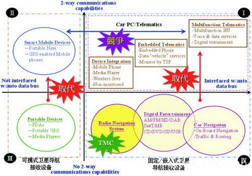 本文根据美国研究机构Telematics Research Group以导航系统与汽车之间的相融度(Interfaced with auto data bus)与双向通讯的能力(2-way communications capabilities)。