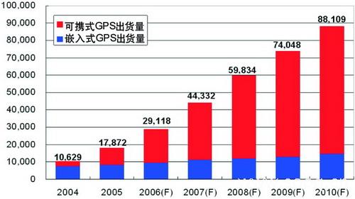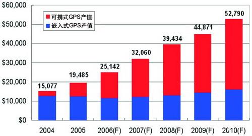 整体车用GPS市场出货量方面,包含固定式/嵌入式车用GPS(Telematics、DVD/CD、FM Radio型车用导航系统)与便携式车用GPS(纯GPS、PDA整合GPS、Smart Phone整合 GPS与PDA以及AGPS手机)推估,预估全球整体车用GPS产品,将由2004年1,063万台成长至2010年8,811万套,如图2所示;车用 GPS产值方面,随着GPS 芯片价格由2002年的25美元下滑至2005年14美元及2006年的12美元,GPS手机出货量攀升,2004年日本政府将GPS列为手机基本配备, 2005年美国FCC规定销往美国的手机都需具备GPS功能,便携式GPS出货量由2004年仅315万台成长至2010年7,355万台,带动整体车用GPS产值由2004年仅106.3亿美元成长至2010年的881.1亿美元,如图3所示。