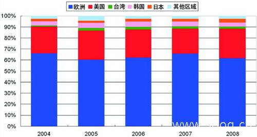 如图8所示,全球PND出货量随着GPS手机出货持续攀升,预估将由2004年的241万台成长至2010年的7,355万台,至于各市场出货比重分布,随着欧洲与北美市场PND市场逐渐趋于饱和,中国因举办2008年北京奥运及2010年上海世界博览会,以及中国市场具备欧、美地域广大及平均开车时间长等特性,整体PND出货比重将由2004年北美及欧洲合计占70%至75%下滑至2010年70%以下,而亚太地区将因中国市场因素,由2004年的不到20%成长至2010年接近30%,可以预期亚太地区为未来GPS手机高速成长最大的市场区域,如图8所示。