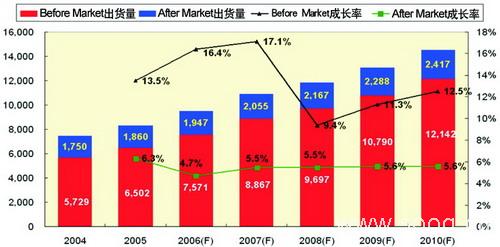 嵌入式/固定式车用GPS可分为Before Market(或称Original Equipment,OE)与After Market,Before Market(BM)即一般所谓由原厂或销售商预先安装的原装市场,After Market(AM)即所谓车辆售后由消费者自行购买并安装的改装或零售市场,根据IEK研究报告指出,2004年至2010年全球嵌入式/固定式车用 GPS系统,随着美国E-911与欧盟E-112政策激励,BM/OE与AM出货比重已由2004年以前的65%与35%改变成85%与15%左右,全球 BM/OE车用GPS出货量将由2004年的572.9万部套成长到2010年的1,214.2万套,年复合成长率为12.5%,AM车用GPS出货量方面,将由2004年的175万台成长至2010年的241.7万台,但在年复合成长率方面仅5.5%,如图5所示。